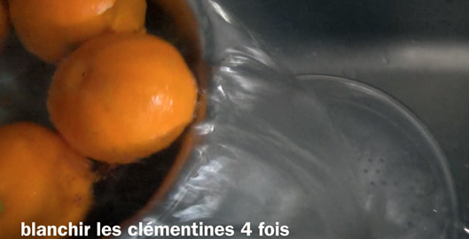 2. Pour blanchir les clémentines : déposez les clémentines dans une casserole d'eau froide, portez à ébullition et égouttez les clémentines. Recommencez cette opération 4 fois de suite.