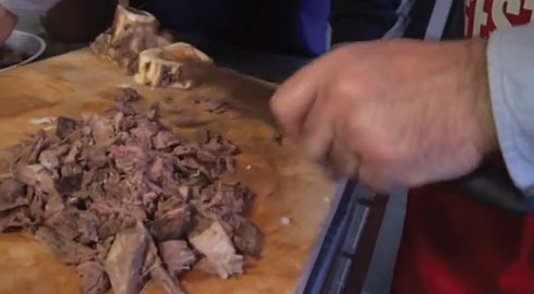 Pendant que les oignons rissolent, effilochez la viande, lorsque les oignons sont dorés ajoutez le boeuf et le bouillon.