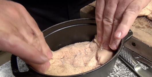 - Étape 8 [b]Je n'aime pas que le gras se niche au milieu du foie gras, donc il faut découper un carton de la forme et de la taille de la cocotte, et le mettre sur la terrine, presser sur le gras, pour faire remonter complètement le gras. Posez dessus un petit récipient rempli de sel par exemple, et hop au frigo pendant 24 h jusqu’à 3-4 jours[/b]…