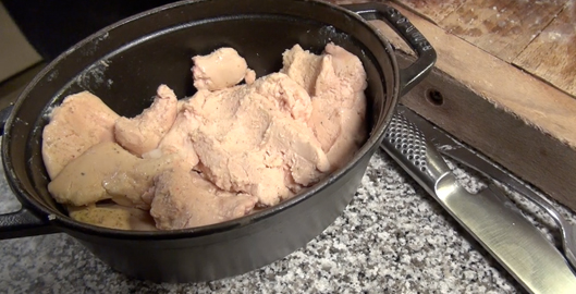 Je vais aller à l’encontre de tous les principes, enfin presque tous. Il faut quand même déveiner ce foie gras avant de préparer la terrine!(mais bon avec la vidéo c’est facile…)