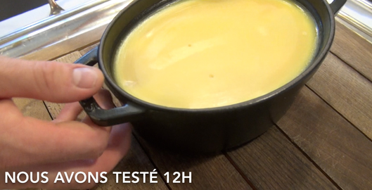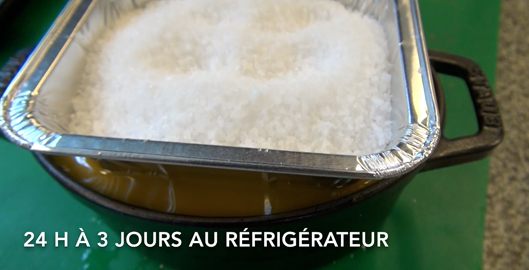 - Étape 8 [b]Je n'aime pas que le gras se niche au milieu du foie gras, donc il faut découper un carton de la forme et de la taille de la cocotte, et le mettre sur la terrine, presser sur le gras, pour faire remonter complètement le gras. Posez dessus un petit récipient rempli de sel par exemple, et hop au frigo pendant 24 h jusqu’à 3-4 jours[/b]…