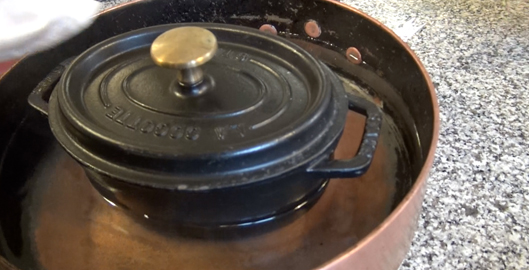 - Étape 5 : Fermez la cocotte avec son couvercle, mettez la cocotte dans une casserole avec de l’eau chaude dans le fond pour faire une cuisson traditionnelle au bain marie.