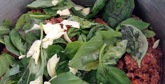 Ingrédients • 6 gousses d’ail écrasées • 1 échalote ciselée • huile d’olive • 700 g de steak haché à 5 % de matière grasse si possible • une boite de tomates pelées entières (400 g) • 700 g de coulis de tomate • 500 g de pulpe de tomate • 200 g – 300 g de champignons de Paris coupés en lamelles • 1 poignées de basilic au moins (toutes les herbes que vous avez) • Thym • Romarin • 1 feuille de Laurier