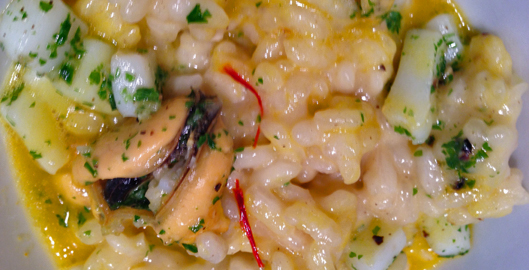Risotto moules et blancs de seiche, délicieux petit bouillon safrané!