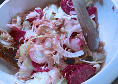 C’est la première fois que je prépare cette salade au poulet ! J’avais envie de légumes après les excès du week-end et je me suis amusé à préparer cette salade composée du dimanche avec les restes de mon frigo, betterave – concombre – fenouil – échalote – poulet …Le petit secret ICI c’est l’assaisonnement du poulet!